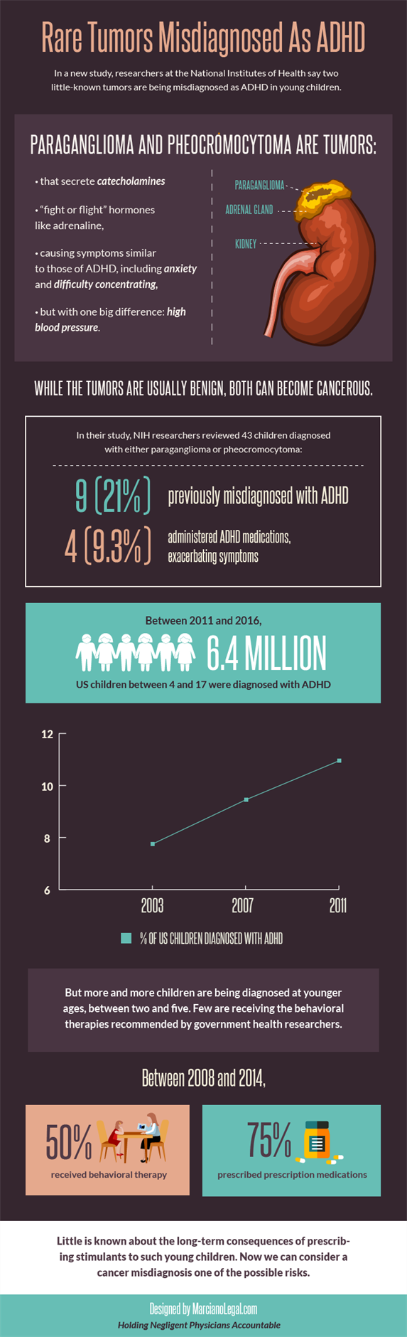 Two little-known tumors, which can become cancerous, are being misdiagnosed as ADHD in kids, according to a new study out of the National Institutes of Health. Pheocromocytomas and paragangliomas are tumors, usually benign, that grow in or around the adrenal gland and secrete a range of stimulant chemicals, potentially mimicking the symptoms of Attention Deficit Hyperactivity Disorder.
